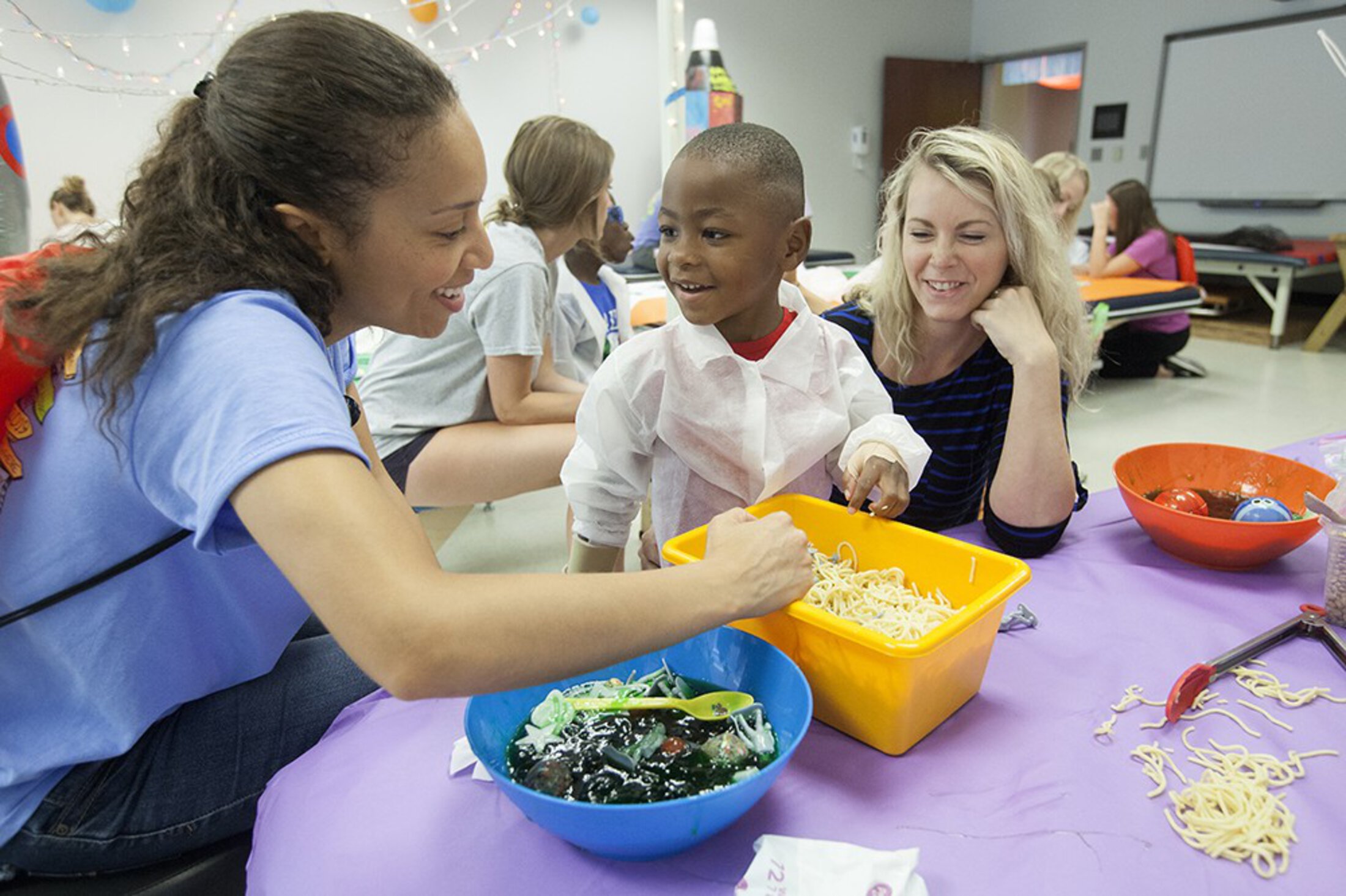 Play-Doh, bubbles, painting stations, a mini bounce castle, a food dye experiment and to top it all off – pinatas! The laughter and goofy kid energy bouncing off the walls at the College of Health Professions is a pretty good indication that the children at Camp Hand to Hands are enjoying themselves. But this camp, now in its 18th year, serves important therapeutic and educational purposes.
