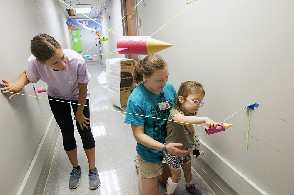 The camp uses constraint-induced movement therapy for children with weakness on one side of their bodies, known as hemiparesis/hemiplegia. The children wear mitts on their strong hands, forcing them to use their weaker hands to complete the activities.