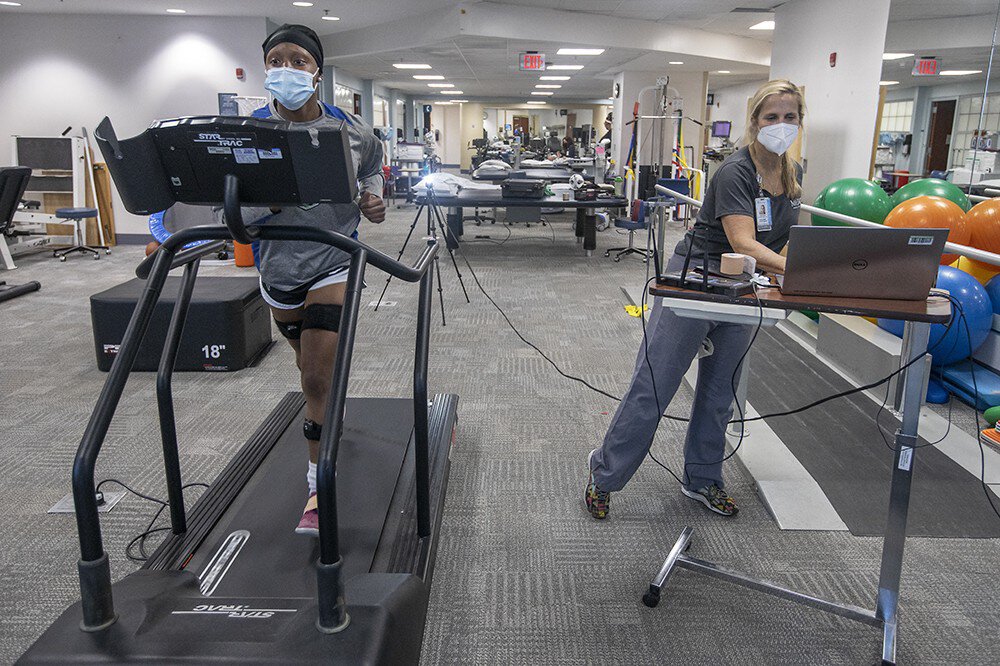 High school soccer player Korbin Heyward, with sensors on areas of her body that physical therapist Stephanie McGowan wants to monitor, runs on a treadmill. Heyward once worried she'd never walk again after a serious injury during a tournament.